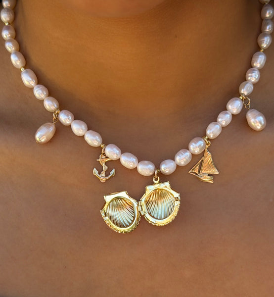 16 inch Genuine white pearls with gold hematite beads necklace, 14kt goldfilled sailboat and anchor charms, pink dangling pearl charms and shell locket.